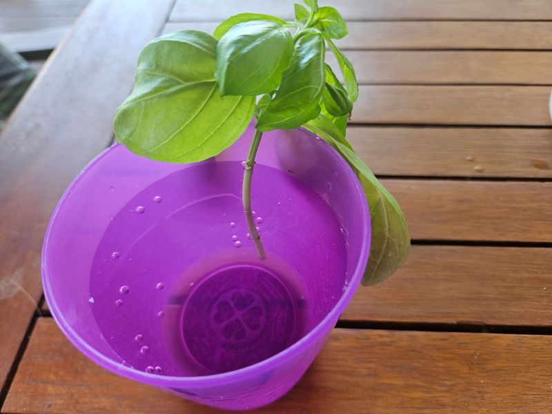 Egy szép, egészséges cserepes bazsalikommal kezdtem, amit egy boltban vettem. Egyszerűen fogtam és levágtam az egyik szárát ollóval és beletettem egy pohár vízbe. Ügyeltem arra, hogy a levele ne lógjon bele. A vizet 2-3 naponta cseréltem, és az poharat a teraszra tettem. Sűrűn nézegettem, de semmilyen gyökérkezdeményt nem láttam. Őszintén szólva egy kicsit el is ment a kedvem az egésztől, még az sem érdekelt, hogy a macska a vizéből iszik.