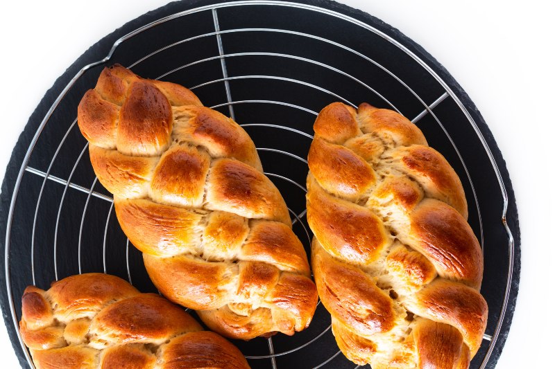 Elkészítés: A margarint és a tej nagyobb részét kis tálba vagy bögrébe tesszük és megmelegítjük a mikrohullámú sütőben. A kenyérsütőgép üstjébe beletesszük az olajat, a cukrokat, a sót és a maradék tejben elkevert tojássárgáját. Ha a felmelegített tejben felolvadt a margarin, azt is beleöntjük az üstbe, majd rászórjuk a lisztet, végül tetejére morzsoljuk élesztőt és az esetleges mazsolát, aszalt gyümölcsöket. A kenyérsütőgépben 1:50 percig dagasztjuk és kelesztjük. Amennyiben mégsem kenyérsütőgéppel dolgoznánk, akkor a hagyományos módszerrel dagasztjuk, majd kelesztjük kb. 1 órán át. Ha a tészta megkelt, hat egyenlő részre osztjuk és hosszú csíkokat nyújtunk belőlük.